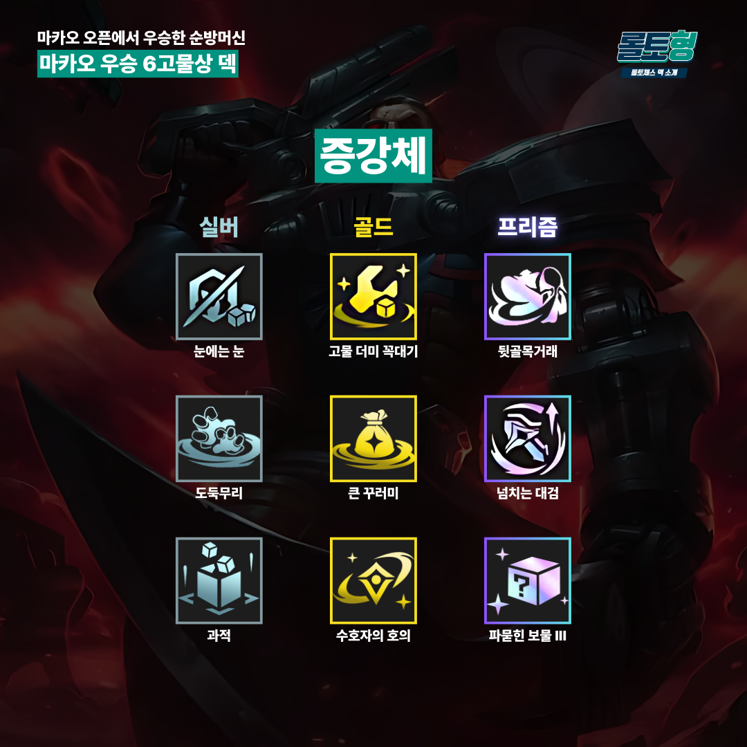 증강체는 다음과 같이 먹어주시면 베스트지만, 아닐 경우는 아이템 많이 많이 주는 증강 먹으시면 좋습니다!