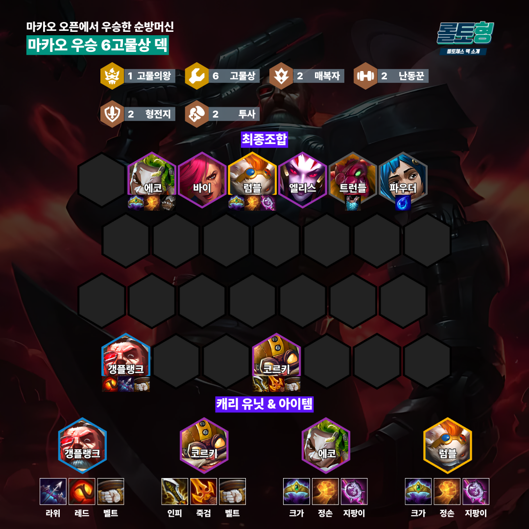 다들 롤토체스 마카오 오픈 보셨나요? 롤토형은 여러분들에게 참신하고! 쉽고! 좋은 덱! 찾아드리기 위해 전 경기 다 챙겨보고 좋아 보이는 덱에 대해 하나하나 연구했습니다.