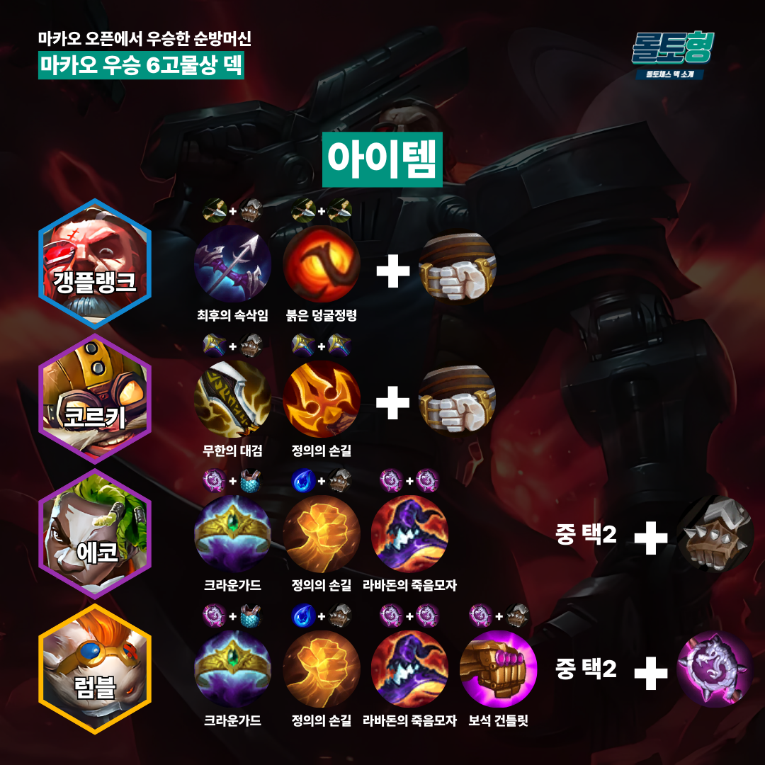 갱플랭크와 코르키에게 거인의 허리띠를 넣어주는 이유는 탱커파괴자를 만들어 주기 때문입니다.